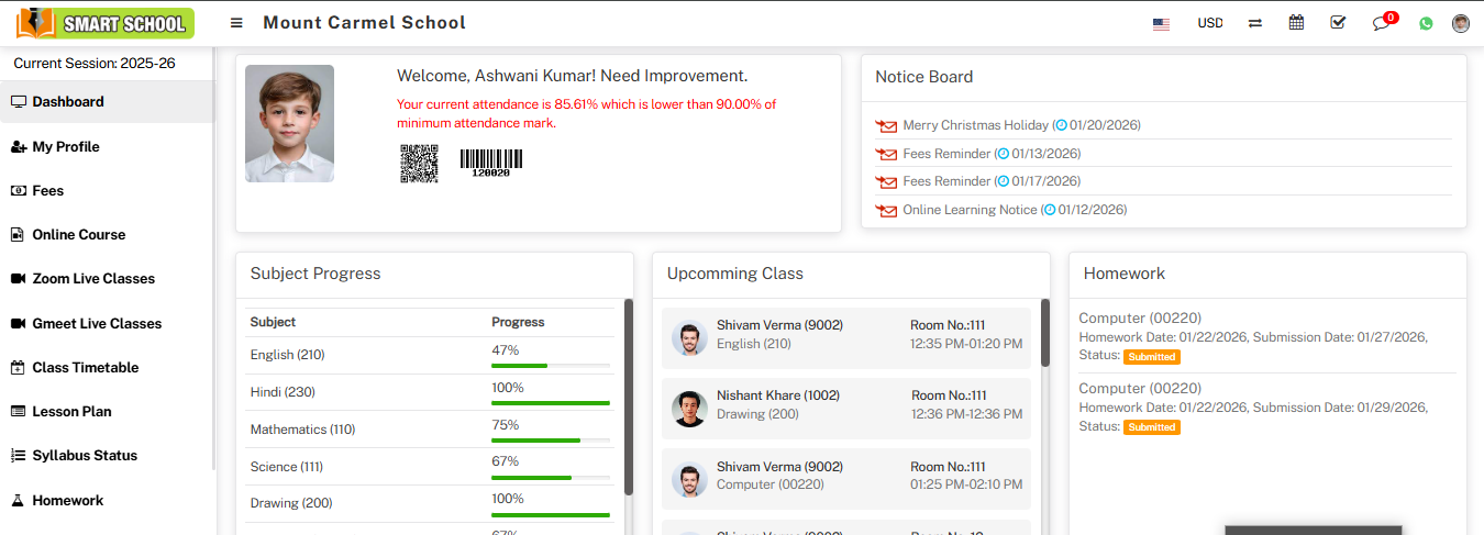 With the help of this feature, you can set the limit of attendance in the form of a percentage and then click on the save button. The attendance limit will be set and a message will be displayed on the student dashboard. In the low attendance limit, one question mark is available, it will show as Below it attendance will be mark as low attendance.