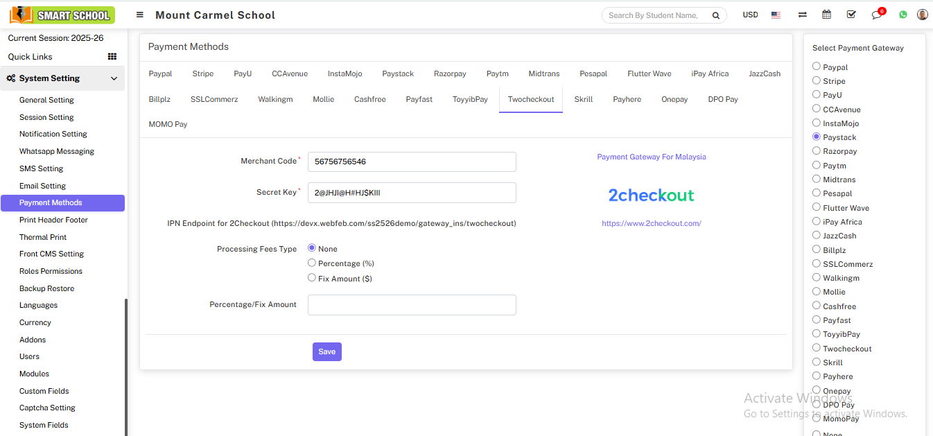 For allowing Students/parent to pay their payment online then you must have to enable any one of payment gateway, for this go to System Settings > Payment Methods then select any payment method from top of the page then enter your payment gateway account details in required fields then click on the Save button.