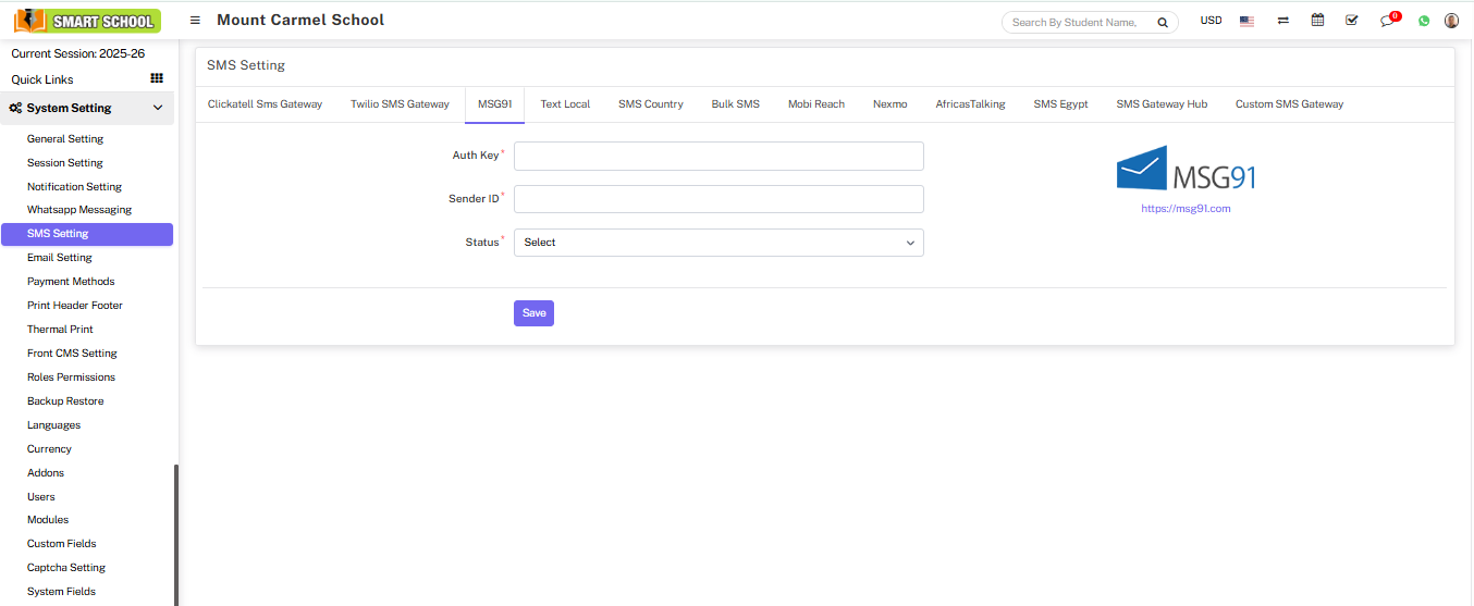 Here we are providing 11 SMS Gateway namely Clickatell SMS Gateway, Twilio SMS Gateway, MSG91, Text Local, SMS Country, Bulk SMS, Mobi Reach, Nexmo, AfricasTalking, SMS Egypt, Custom SMS Gateway in our Smart School.