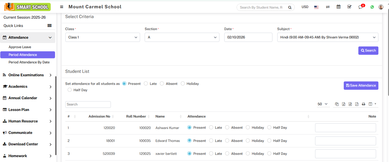 Now, mark the Attendance as (Present, Late, Absent, Holiday, Half day) and in Note column mention the note regarding the attendance of that student then click on Save Attendance button.