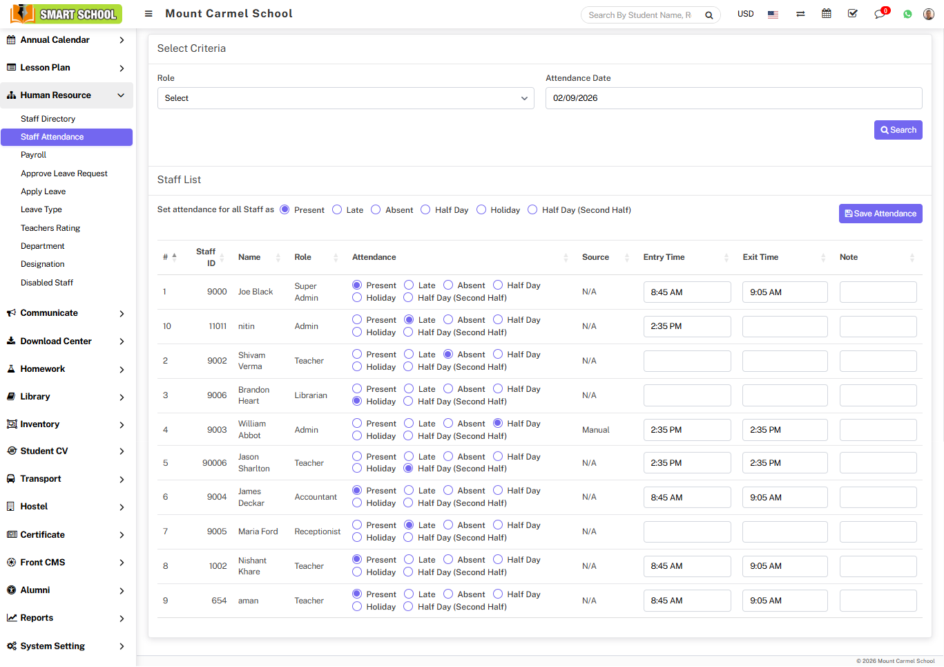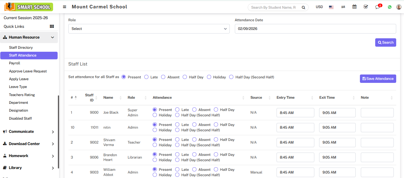Here select Role and Attendance Date and then click on Search button. The list of staff will be shown in below of the page.