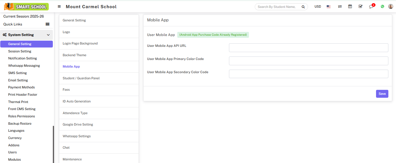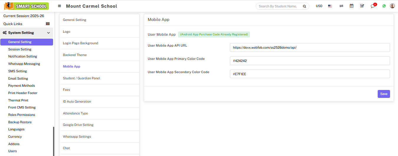 Now enter User Mobile App API URL, User Mobile App Primary Colour Code and User Mobile App Secondary Color Code then Click on Save button.