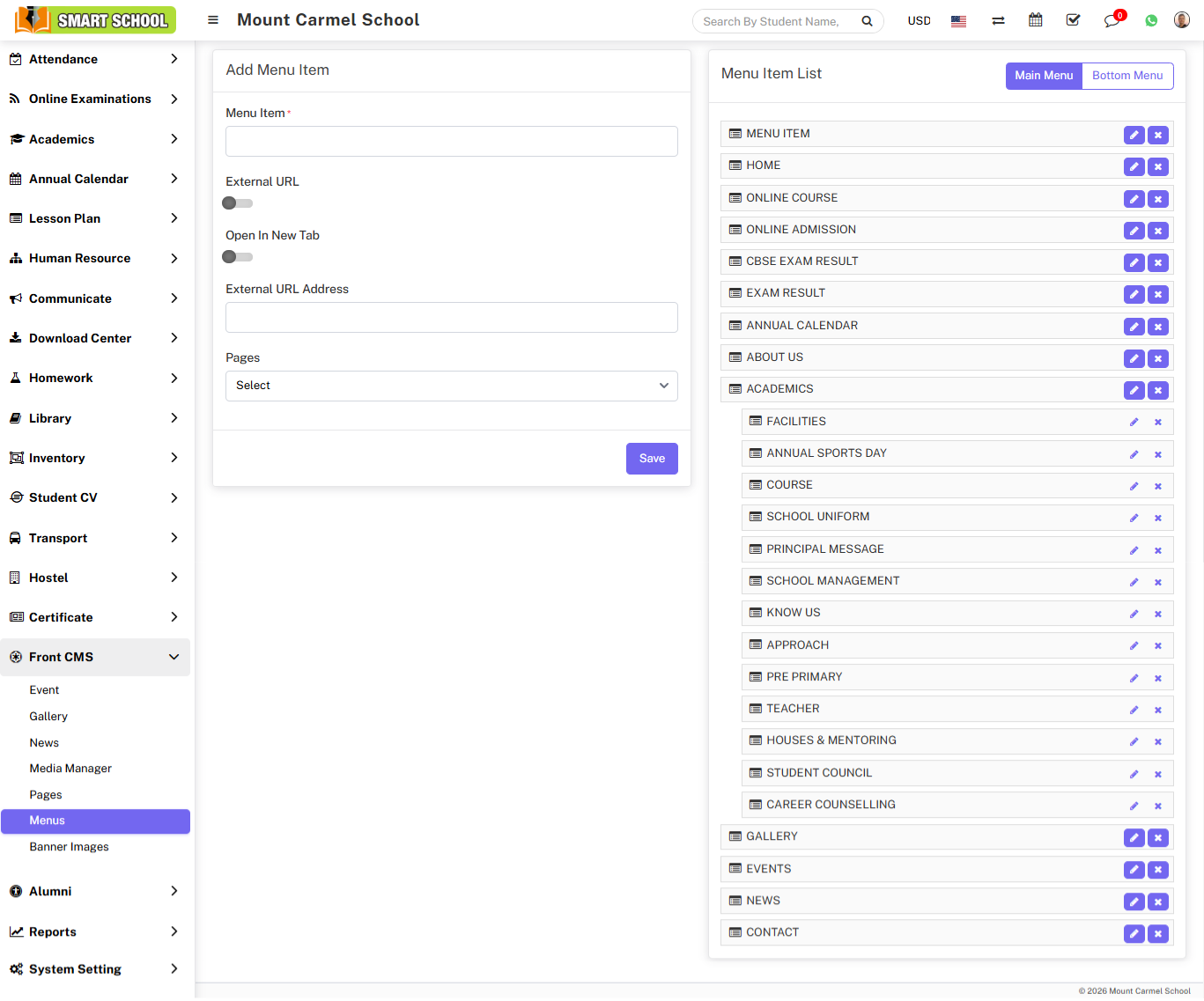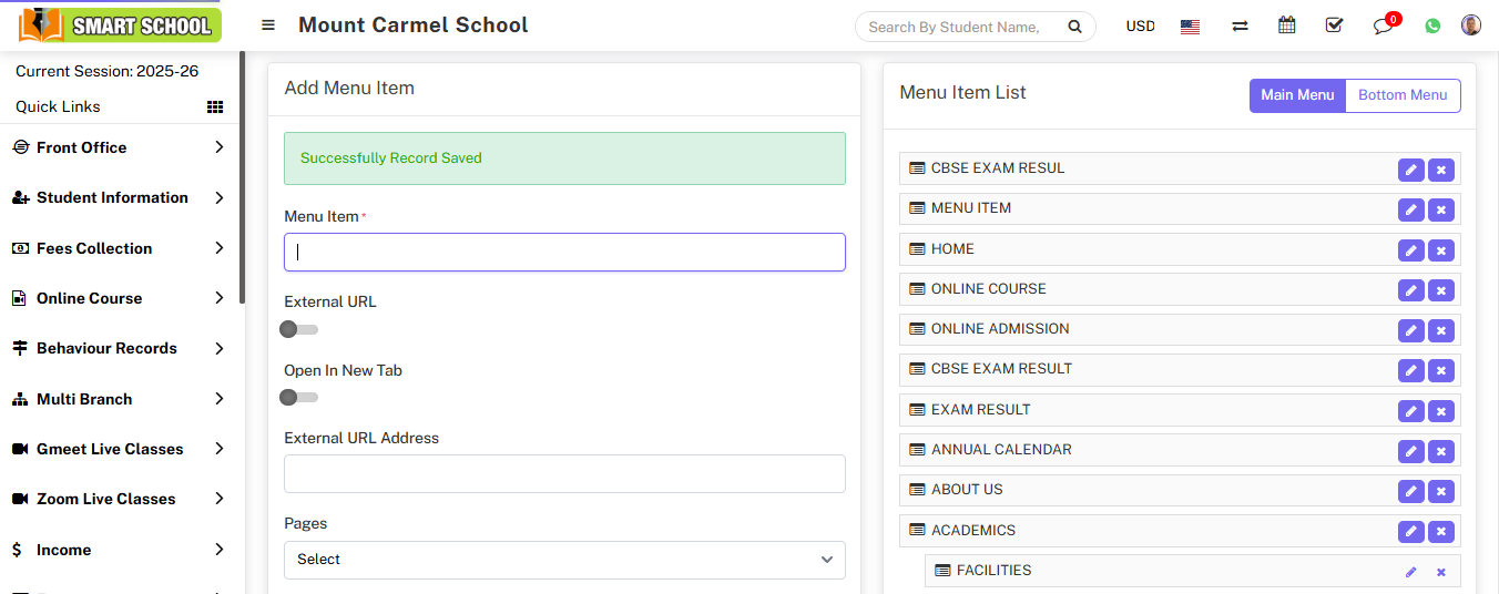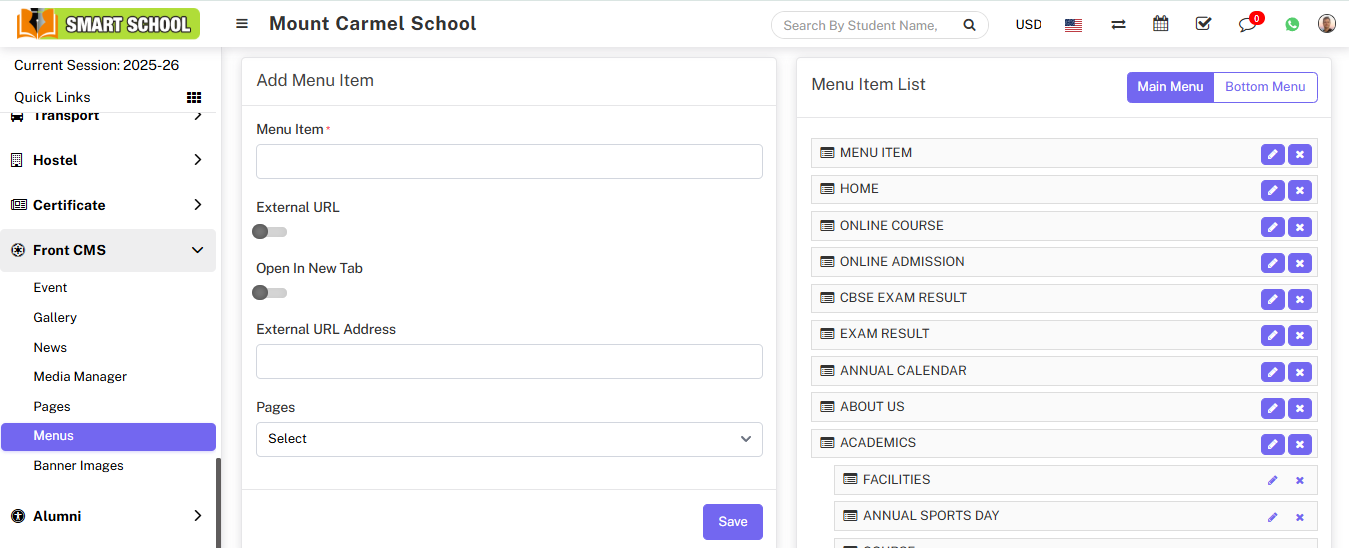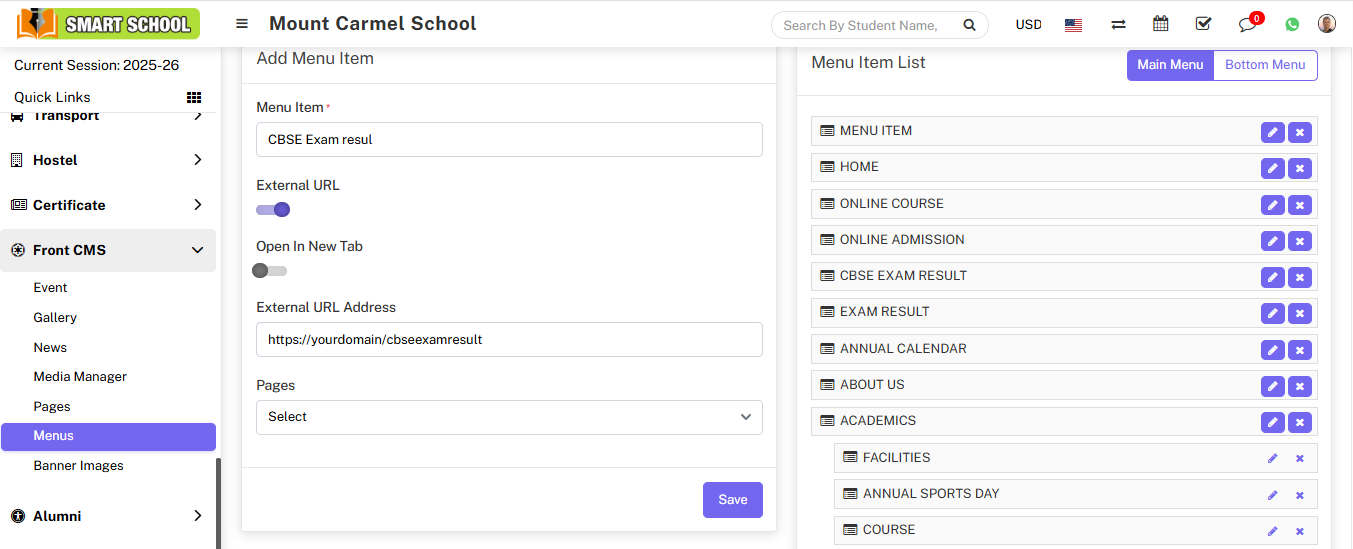 For Example:- In Menu Item enter CBSE Exam result, enable External URL toggle button, disable Open in New Tab, enter External URL Address, Pages drop down don’t select any dropdown then click on the save button.