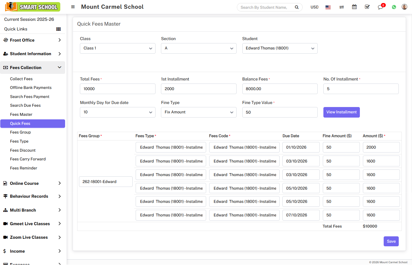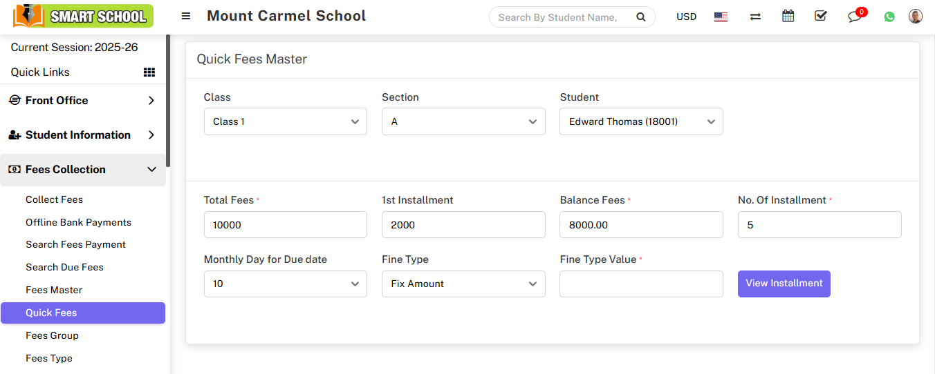 When you select the student to whom you want to create and assign the quick fees, additional fields such as Total Fees, First Instalment, Balance Fees, Number of Instalments, Monthly Due Date, and Fine Type will appear below.