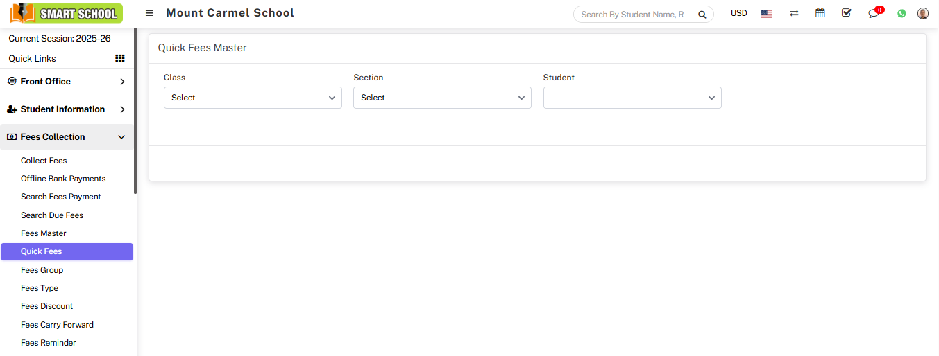 On this page, you can see the Class, Section, and Student fields. When you select the Class and Section, you can choose a student from the Student dropdown to assign the quick fees.