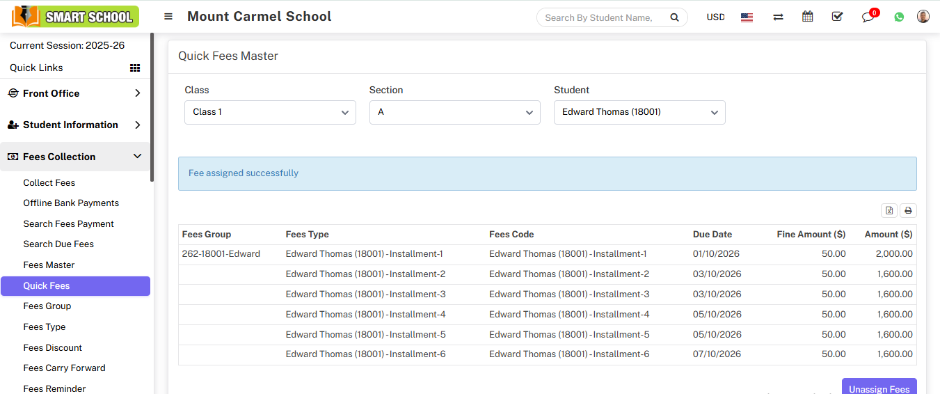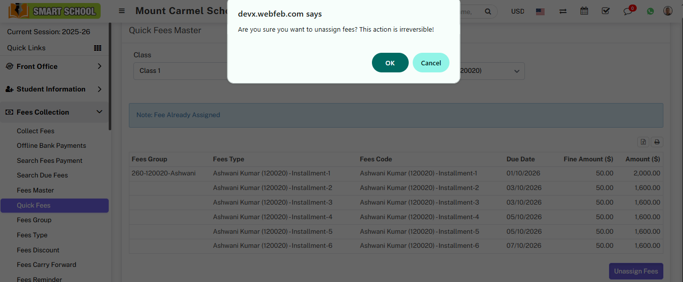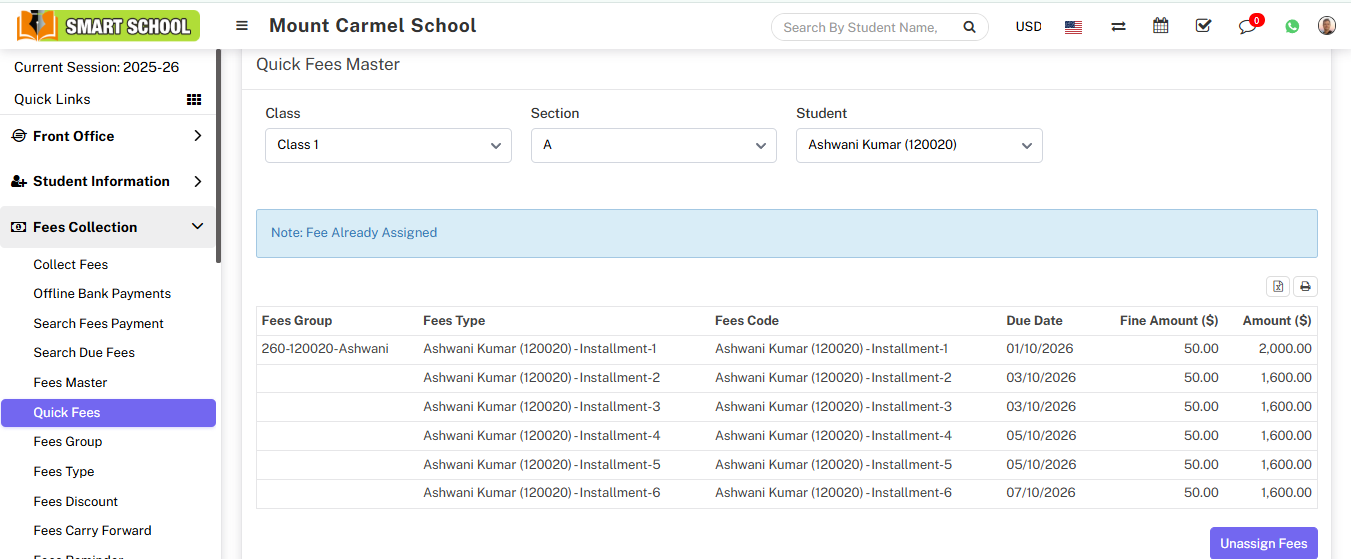 To unassign the assigned fees, go to the Quick Fees page and select the Class and Section of the student. Then, choose the student whose fees you want to unassign. Below, you will see the list of assigned fees, and above, a note will indicate that the fees have already been assigned. From here, you can proceed with unassigning the fees as needed.