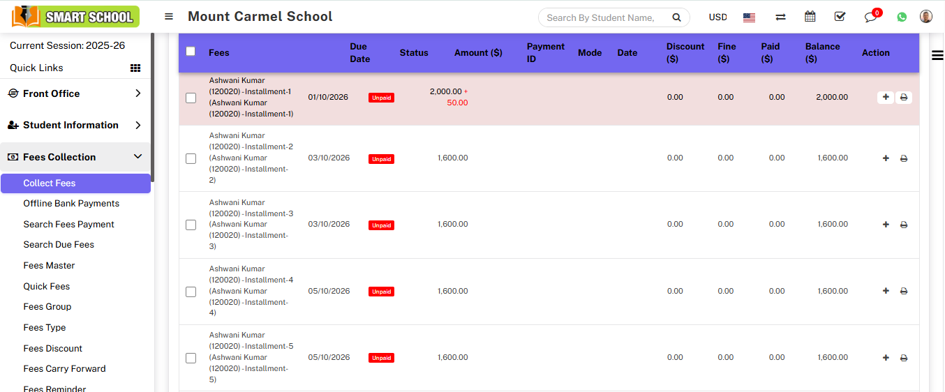 Then, click on Collect Fees for the student to whom you assigned the quick fees.