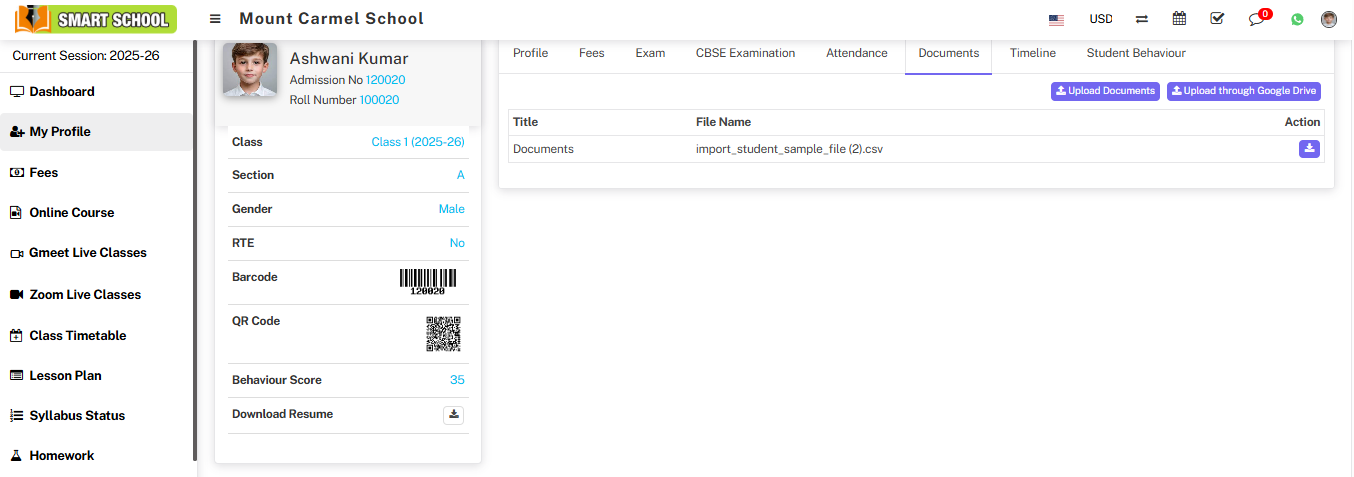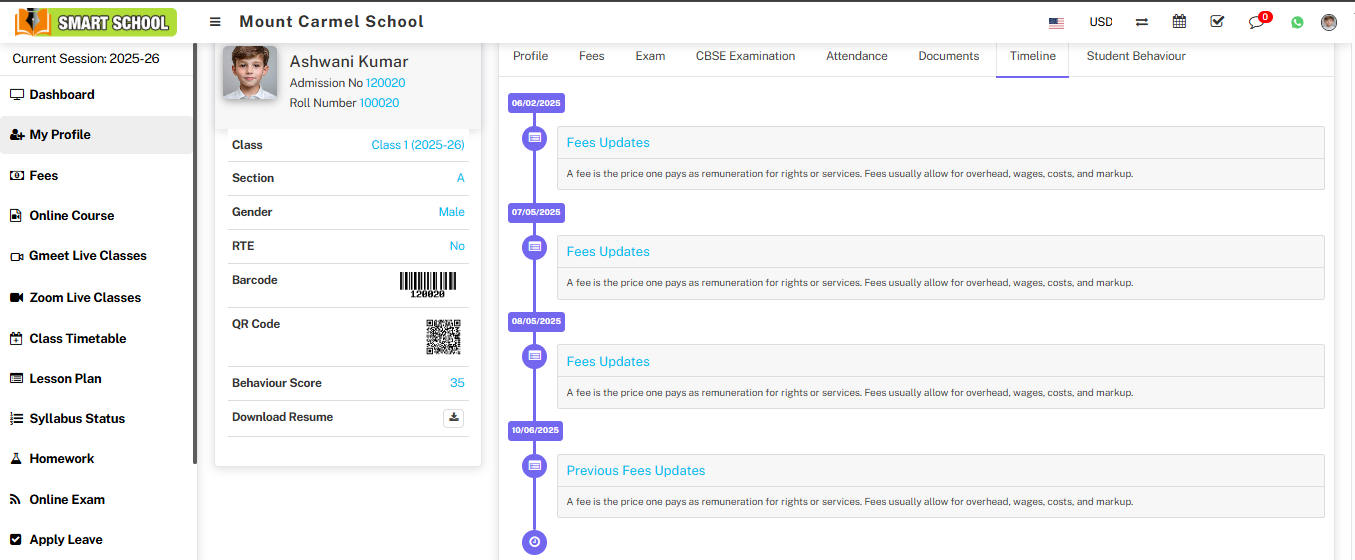 Profile: In the Profile section, you can view all the relevant details of the student.
