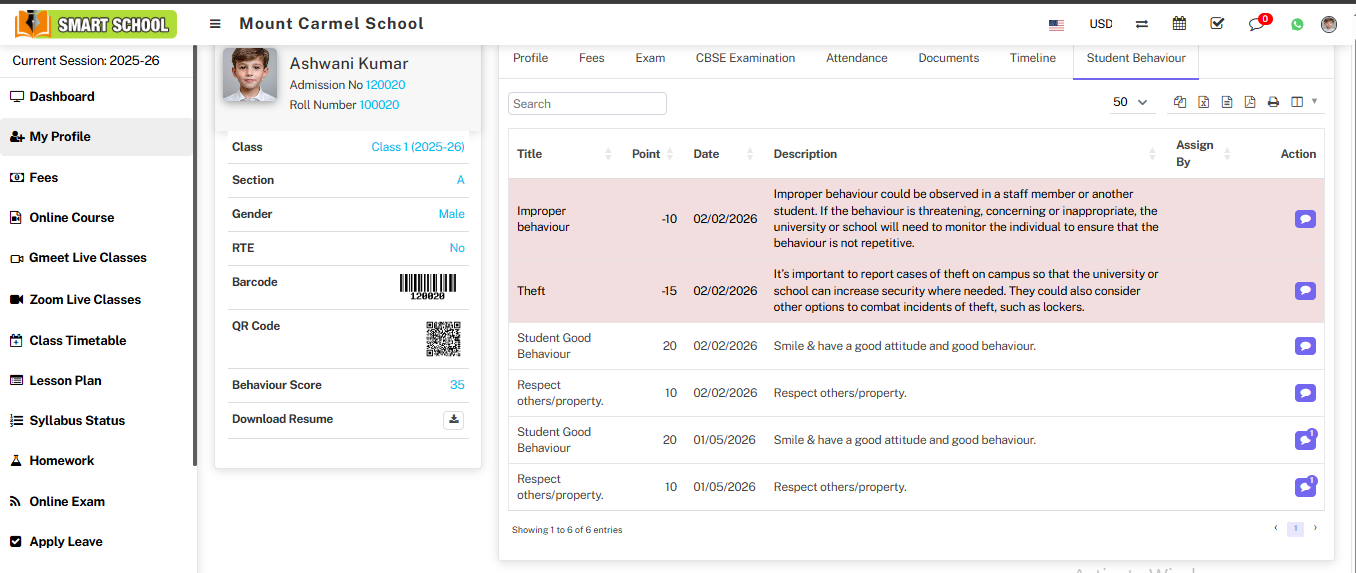 Student Behaviour: In the Student Behaviour section, you can view the assigned incidents.