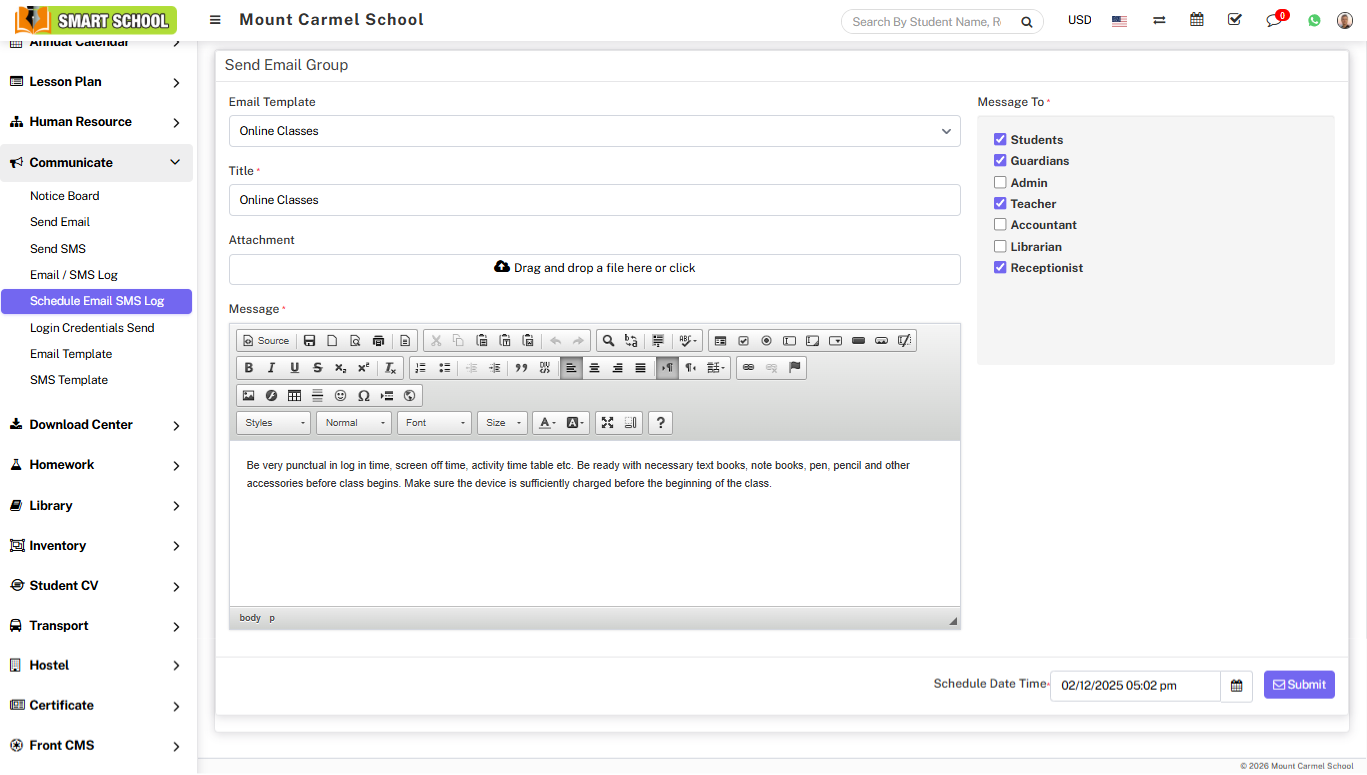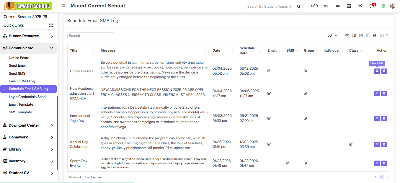 To view the Schedule Email SMS Log, go to Communicate > Schedule Email SMS Log; here you can view the entire Schedule Email SMS Log.