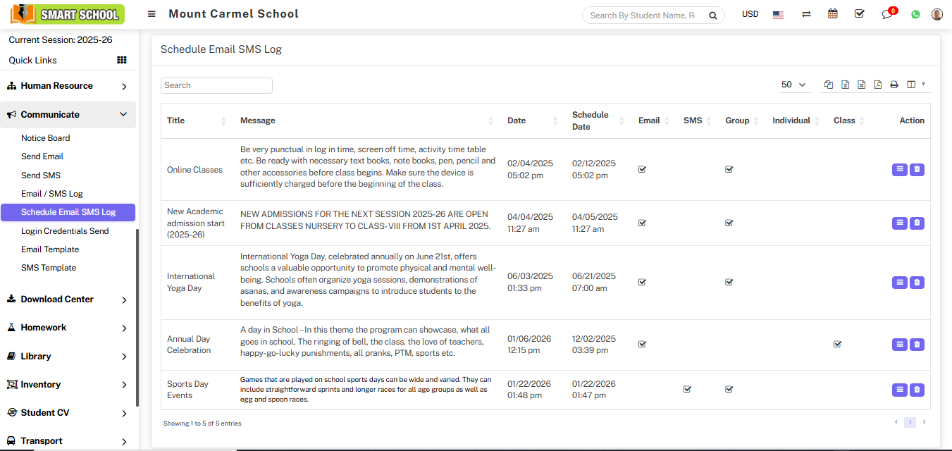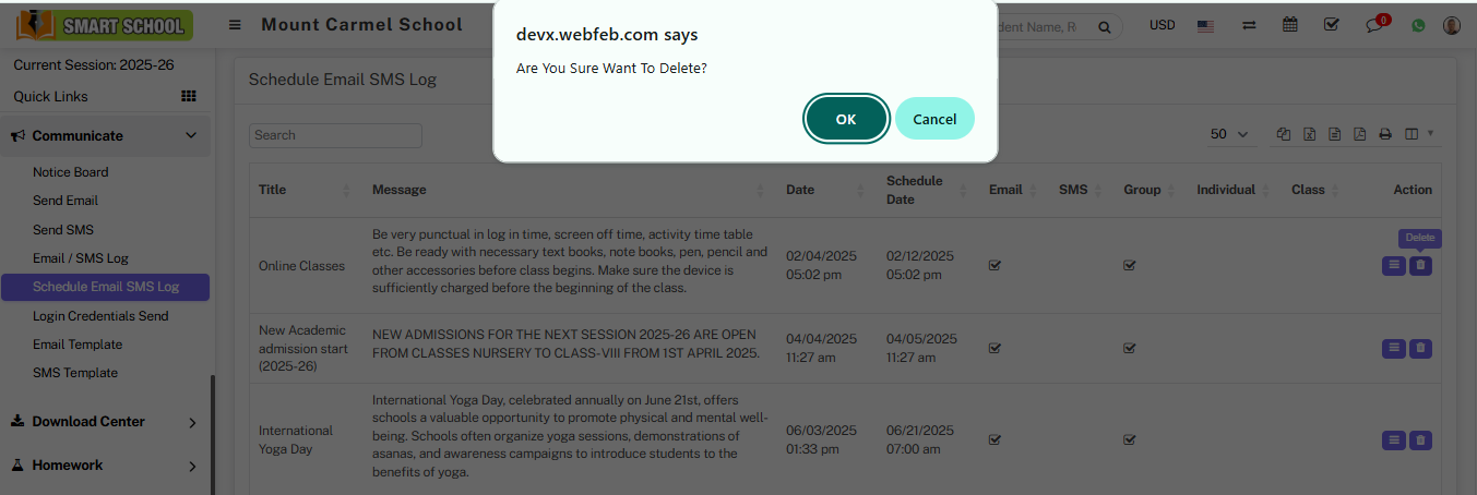 To Delete them, simply click on the Delete icon in the Action column, and your schedule email sms will be successfully deleted.
